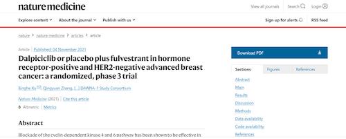 11月4日,国际四大医学期刊之一、英国《自然》旗下《自然医学》(Nature Medicine)在线发表CDK4/6抑制剂达尔西利(SHR6390)联合氟维司群治疗既往内分泌治疗后疾病进展的HR+/HER2-晚期乳腺癌的多中心、随机、双盲III期临床研究(DAWNA-1研究)中期分析结果报告,首次对氟维司群(雌激素受体降解剂)±达尔西利治疗激素受体阳性晚期乳腺癌的有效性和安全性进行了比较。研究结果显示,达尔西利+氟维司群组与安慰剂+氟维司群组相比,无进展生存期(PFS)显著延长。该项研究由中国医学科学院肿瘤医院徐兵河教授担任leading PI,全国39家医院参研,由A8国际医药临床研发团队支持完成。