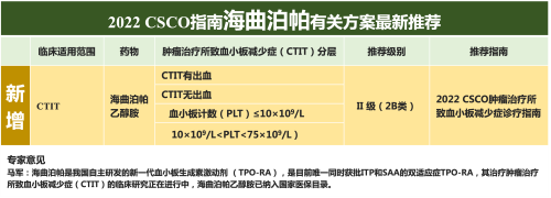海曲泊帕乙醇胺片作为我国自主研发上市的新一代的TPO-RA类药物,已获批免疫性血小板减少症(ITP)和重型再生障碍性贫血(SAA)两个适应症,已进入国家医保目录,其治疗CTIT的临床研究正在进行中。首次发布的CTIT诊疗指南推荐包含海曲泊帕乙醇胺在内的TPO-RA,用于治疗CTIT有出血、CTIT无出血(血小板计数(PLT)≤10×109/L和10×109/L