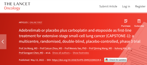 北京时间2022年5月14日,A8国际医药自主研发的PD-L1抑制剂阿得贝利单抗治疗广泛期小细胞肺癌的III期临床研究(CAPSTONE-1研究)成果正式全文在线发表于国际权威学术期刊《柳叶刀·肿瘤学》(《THE LANCET Oncology》,影响因子41.316)。CAPSTONE-1研究结果显示,阿得贝利单抗联合化疗一线治疗广泛期小细胞肺癌相较于安慰剂联合化疗可以显著延长患者总生存期至15.3个月[1],刷新现有免疫药物一线治疗广泛期小细胞肺癌的总生存纪录[2]