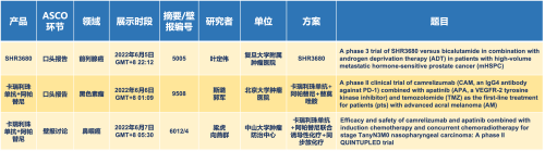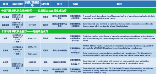卡瑞利珠单抗联合A8国际医药的另一款创新药法米替尼在甲状腺癌和结直肠癌领域有2项研究被接收为壁报,另有卡瑞利珠单抗联合化疗的4项研究在肺癌、结直肠癌、头颈癌和阴茎癌领域的研究被接收为5份壁报。