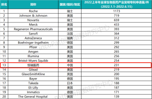 专利是药企最有价值的资产之一,是企业发展的基石,对做原创创新的企业尤为重要。全球专利数据库incoPat创新指数研究中心对2022年1月1日至2022年6月15日公开的全球生物医药产业发明专利申请数量进行统计排名,生物医药产业专利涉及生物技术药、基因工程药物、疫苗、诊断试剂、微生态制剂、血液制品等技术领域。入榜企业/医院主要来自13个国家、组织或地区,罗氏、强生、诺华分别位列前三,A8国际医药(231件)排名第13位,领跑中国药企。