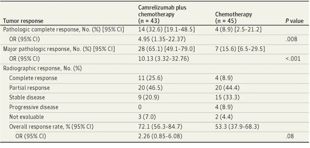 北京时间8月3日,A8国际医药创新药卡瑞利珠单抗联合化疗(Cam+CT)对比化疗(CT)新辅助治疗ⅢA/ⅢB (T3N2) 期非小细胞肺癌(NSCLC)结果在线发表于国际权威期刊JAMA Oncology[1]。该研究是由空军军医大学唐都医院姜涛教授、雷杰教授团队联合陕西省肿瘤医院雷光焰教授团队、兰州大学第二附属医院王成教授团队共同参与的一项随机对照、多中心、Ⅱ期临床研究(TD-FOREKNOW,NCT04338620)。研究结果显示,与化疗相比,卡瑞利珠单抗联合化疗新辅助治疗NSCLC显著提高了病理完全缓解(pCR)率(32.6% vs 8.9%,OR=4.95,95% CI :1.35-22.37, P =0 .008),且安全性良好。本研究是卡瑞利珠单抗新辅助治疗可切除NSCLC患者的首个随机对照研究,为NSCLC新辅助免疫治疗再添新证。